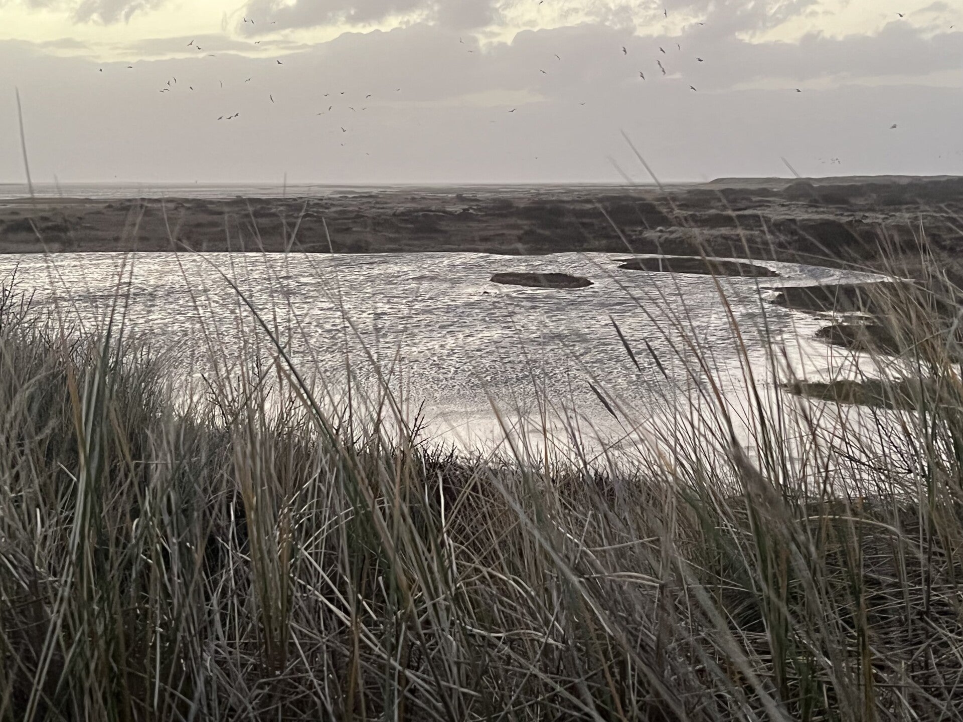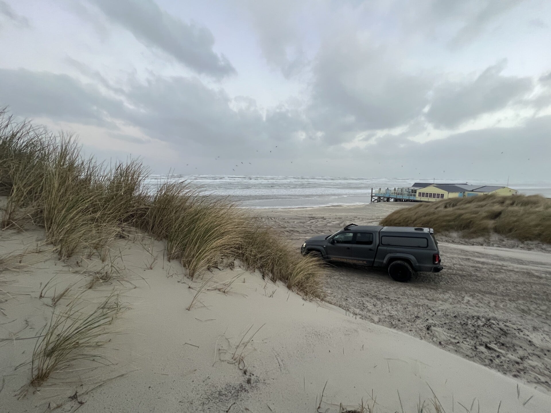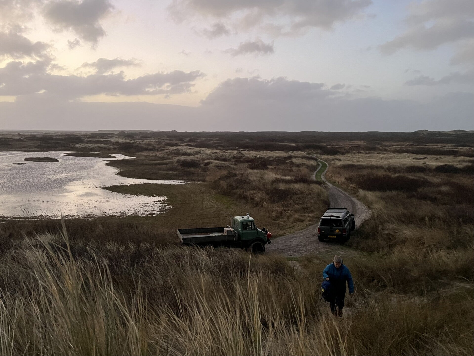 30 januari: Met hoog water aan de binnenkant van de duinen zover mogelijk richting Amelander Gat proberen te komen met fotograaf.